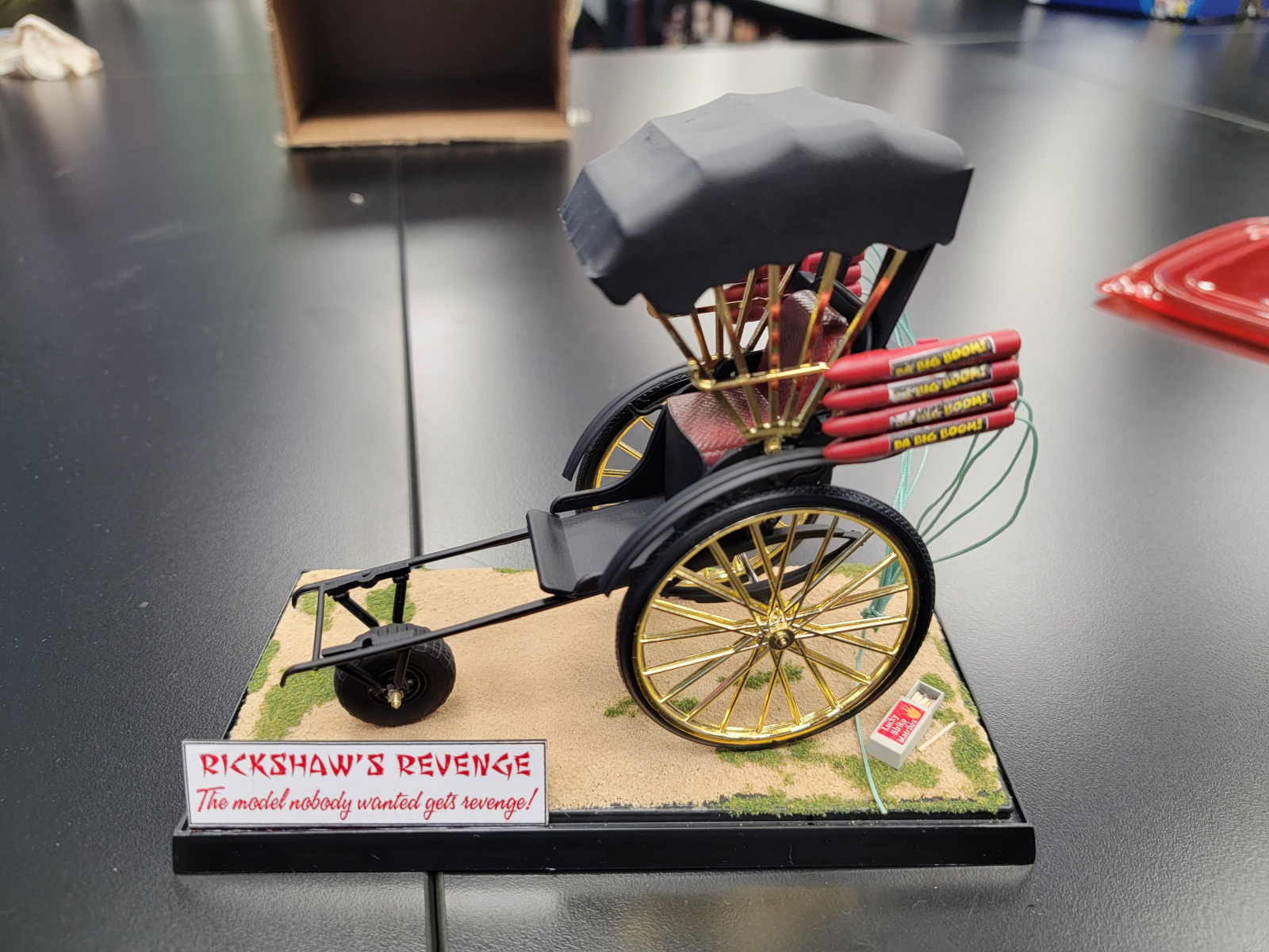 20221215_202835A REAL TREAT was the placement of the completed “Rickshaw” at the meeting.  The Rickshaw has been a ‘gag gift’ in the club for many Christmas exchanges and it keeps going home with someone new each year.  Last year, Phill Allen’s son wound up with it and he actually BUILT IT to bring back.  Unfortunately he was not feeling well on the night of the meeting, but Dad (Phill) brought it in to share with the members.  He added rockets with fuses to each side and generally dressed it up a bit with fantasy upgrades, and did a fantastic job on the model itself.